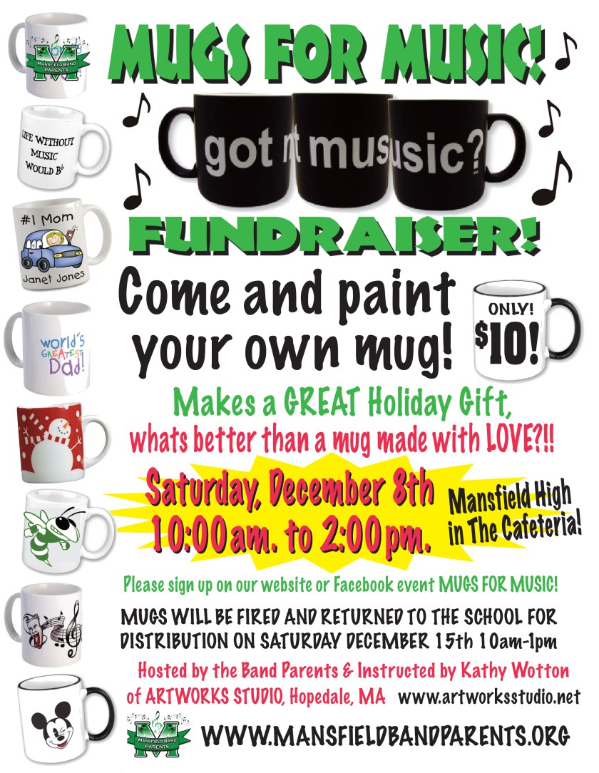 Sign up below for our “Mugs for Music” Event to be held in the MHS cafeteria on December 8th. For just $10, you can custom design your own coffee mug which will be kiln fired and ready in time for Christmas! This is a great activity for kids too, whether they want to make a mug for themselves, or for a special relative. And best of all, a portion of the proceeds from this event will go to the Mansfield Band Parents Association in support of music in our schools!